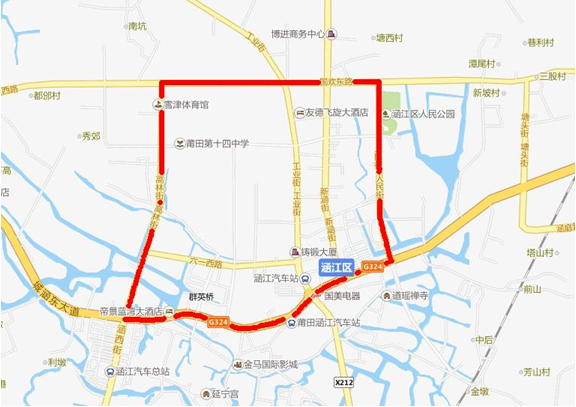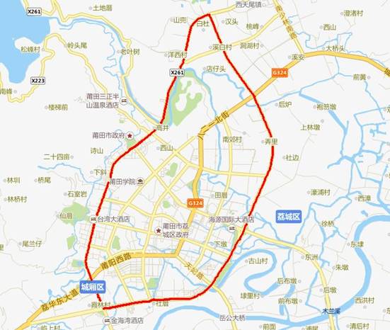 2.涵江区:由人民街(北起人民街与国欢路交叉口,南起人民街与G324国道交叉口)、国欢路(东起人民街与国欢路交叉口,西起国欢路与高林街交叉口)、高林街(北起国欢路与高林街交叉口,南起高林街与G324国道交叉口)、G324国道(东起人民街与G324国道交叉口,西起高林街与G324国道交叉口)围成的环形区域(含本道路)以内的所有道路,具体见附件2。