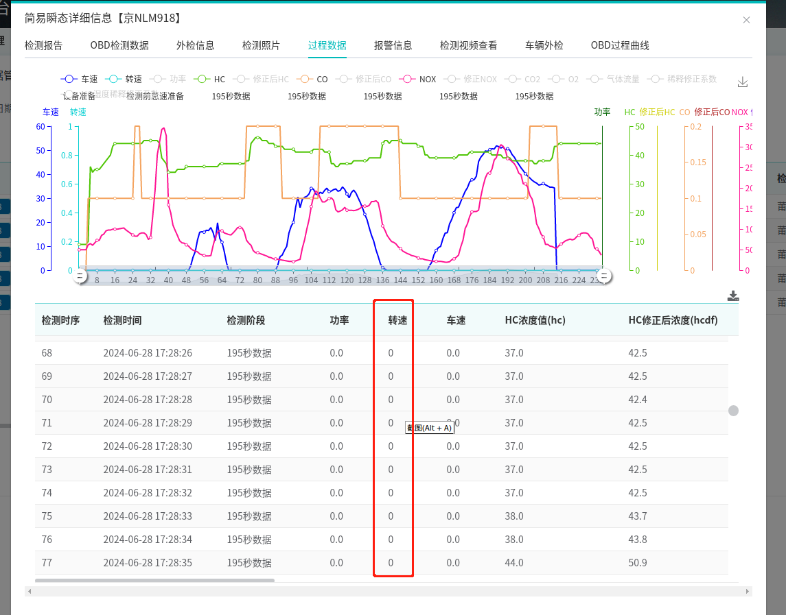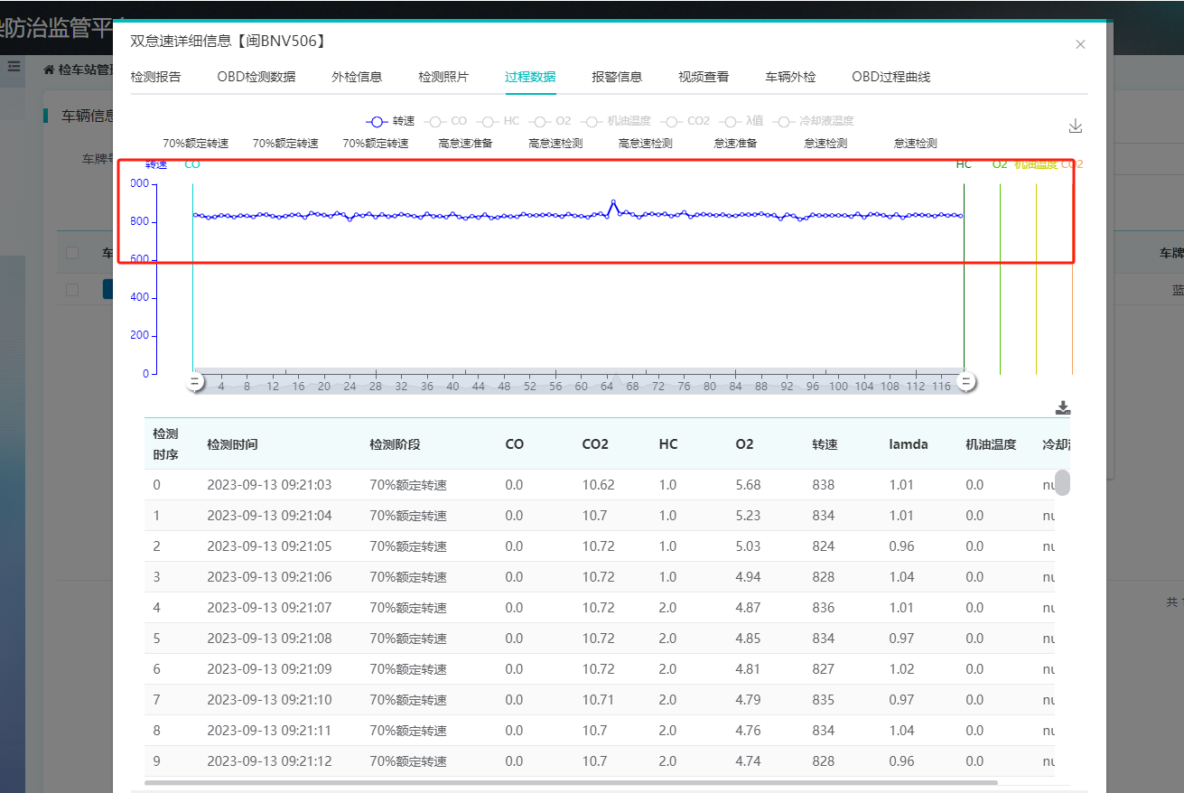被检车辆车辆发动机额定转速为5000r/min,但过程数据显示检测过程中转速未超过1200r/min